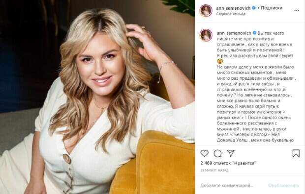 Певица Анна Семенович решила раскрыться перед поклонниками и рассказала свой главный секрет позитива Об этом знаменитость пишет у себя в Инстаграм, передает, Politeka.net «Вы так часто пишите мне про позитив и спрашиваете , как я могу все время быть улыбчивой и позитивной ! Я решила раскрыть вам свой секрет