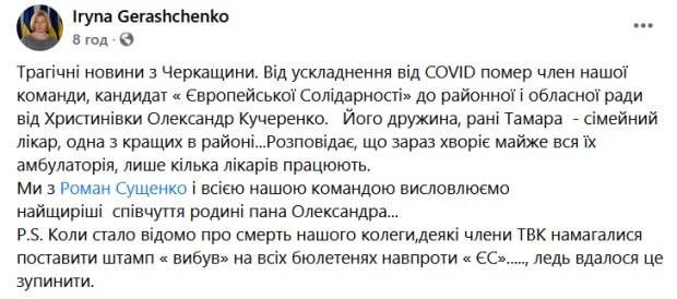 В воскресенье, 25 октября, в Украине проходят местные выборы Украинцы избирают депутатов в местные советы, а также мэров городов и населенных пунктов. Кандидат в депутаты скончался от китайского вируса. Как сообщила в Фейсбук нардеп от «Европейской солидарности» Ирина Геращенко, в Черкасской области от осложнений, вызванных вирусом, скончался кандидат от их команды Александр Кучеренко.