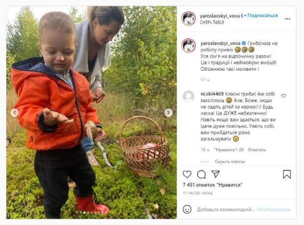 На кадрах Ярославский показал не только себя, но и сестру с детьми. Владимир показал, как все семейство отправилось искать грибы в лес. Но украинцы обратили внимание на одно видео, где маленький ребенок сидит за рулем автомобиля. "Грибочков на работу привез Вся семья на отдыхе вместе! Это и традиции и невероятные эмоции! Обожаю такие моменты!", - написал Ярославский. Фанаты поставили более 7 тысяч лайков и написали комментарии: "Классные грибы! Вплоть себе захотелось. Но, Боже, люди, не сажайте детей за руль !!!! Пожалуйста! Это ОЧЕНЬ опасно! Даже если вам кажется, что вы едете очень медленно. Представьте себе, вам придется резко затормозить", "Ребёнка за руль. И это ещё показывать.....", "По проселочным дорогам можно и ребенка посадить за руль,у нас только так и научилась", "Владимир, не показывайте плохой пример Ребенку не место за рулём, малейшая ситуация и это может закончиться плохо. Вы можете быть уверенны в себе, как водитель на 100%, но, к сожалению, есть много других неадекватных водителей". Напомним, судья "Мастер Шеф" сильно изменился перед новым сезоном, как он теперь выглядит А еще Politeka писала, что судья «Мастер Шеф» Ярославский показал, как сильно похудел и подкачался Также Politeka сообщала, что судья «Мастер Шеф» Ярославский после слухов о романе с коллегой ошеломил новым заявлением