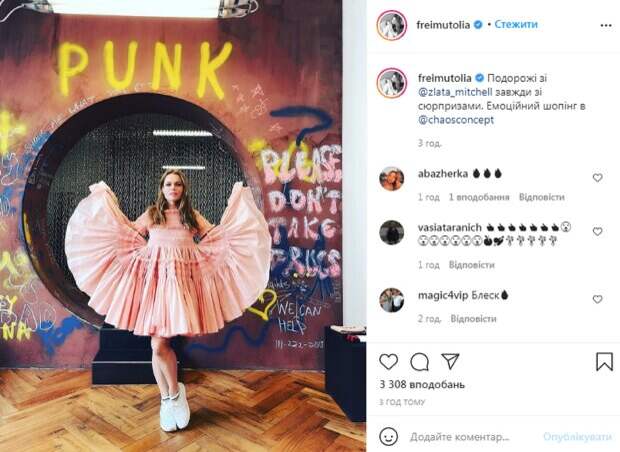 При этом Ольга отметила, что фотография сделана во время "эмоционального шопинга" вместе с дочкой. "Путешествия с @zlata_mitchell всегда с сюрпризами. Эмоциональный шопинг в @chaosconcept", - написала она. На новом фото Фреймут не узнать, она выбрала крайне нехарактерный для себя образ - белые молодежные кроссовки и "кукольное" розовое платье. В комментариях телеведущую засыпали комплиментами и отметили, что такой стиль ей очень идет. "Блеск", "Оля, вы невероятная", "Мечта детства: юбка-солнце! Настроение сразу супер", "Очень по-весеннему", "Невероятно выглядите", - пишут в комментариях. Ранее сообщалось, что Ольга Фреймут решила раскрыть себя украинцам с новой стороны, поделившись своими мыслями и историями из жизни. На одной из фан-страниц Ольги в Instagram появился отрывок из книги, в котором ведущая рассказывает о своем отношении к вопросу равенства между мужчинами и женщинами. Напомним, скандальная Фреймут начала поучать украинок, как правильно краситься: "Не стоит рисовать помадой...". Как сообщала Politeka, Фреймут показала старших детей и похвасталась их талантом, редкие кадры: "В стиле Клода Моне". Также Politeka писала, что Фреймут без лифчика показала украинкам, как правильно фотографироваться: "Избегайте селфі. ..".