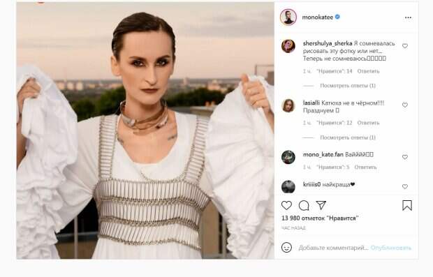 Пользователи сети по-разному реагируют стиль красотки. Некоторые считают, что ее одежда слишком темная. В этот же раз Екатерина решила доказать, что также наряжается и в светлые тона. Так, певица опубликовала фото, в белом платье. Завершили образ железные аксессуары, а также макияж в темных цветах. "Кстати в белом", - написала Павленко. За час пост собрал более 10 тысяч лайков и много комментариев. "Экзотика. Красным в календаре помечу", "Культовая королева