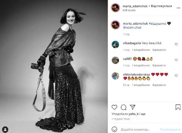 Марта часто размещает черно-белые снимки, считая их более содержательными чем цветные, ведь на черно-белом фото внимание привлекают формы, игра свето-тени, четкость, можно сделать тот или иной акцент... В этот раз артистка позировала в концертном наряде, длинной юбке и блестящем пиджаке, обнажив плечо. руки артистки в перчатках. Девушка держит в руках камеру, фото сделано в движении, будто Марта танцует, волосы разлетелись и лицо расцвело в прекрасной улыбке: "Отдушина", - лаконично назвала снимок Марта. Поклонники отозвались, увидев свою любимую артистку, написав несколько комментариев: "Very beautiful", "