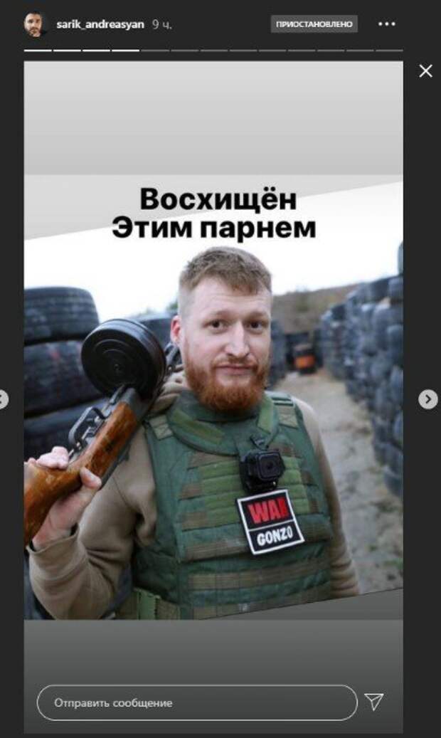 "Восхищен этим парнем. Медаль для русской военной журналистики. Яйца Пегова на грудь всем, кто его критикует", - подписал Андреасян фото, на котором Пегов стоит в окопах и держит в руках пулемет. Сейчас Семен Пегов приехал в Нагорный Карабах, где активно освещает деятельность российских войск и оккупационной власти в Арцахе. Отметим, что Семен Пегов есть в базе "Миротворца" в качестве "провокатора" и "пособника террористов". Напомним, что режиссер Сарик Андреасян ранее разразился обвинениями в адрес Владимира Зеленского и заявил, что Киев якобы поставляет Азербайджану смертоносное вооружение. Кроме этого, одиозный режиссер заявил, что у украинской власти "руки в крови". Зеленский, в свою очередь, не замедлил с ответом. Он предупредил режиссера, что российская пропаганда продолжает клеветать на Украину, заявляя, что Киев якобы поставляет "фосфорные бомбы" на Кавказ. "Сарик, у вас все в порядке с головой? Как можно нести такую ересь? Какие фосфорные бомбы? Какие дети? Фосфорные бомбы запретили со времен Вьетнамской войны, о чем ты говоришь тут Напиши про то армяне стреляют по мирным городам вне фронт зоны", "Сарик джан, а покажи ка общественности фото с жертвами о которых ты написал. Очень интересно посмотреть. Ты же уважаемый человек", "А при чём тут дружба и справедливость? Как политический вопрос,носящий исключительно интернациональный характер, связан с вашими личными взаимотношениями, на минуточку, с действующим президентом Украины?", "Сколько же можно всех обвинять и давить на жалость? Вы только и твердите что Карабах ваш, а теперь и Крым -ваш?! Чтобы к вам относились по человечески, надо и самим быть людьми!", - разнесли его пользователи в комментариях. Напомним, Владимир Зеленский увольняет судей КСУ после демарша. Как сообщала Politeka, Зеленский записал срочное обращение, Украина на грани катастрофы Также Politeka писала, что Зеленский публично поссорился с режиссером, который его снимал