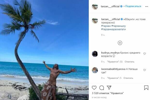 "Небаунти ,но тоже прекрасно)", - подписал популярный стриптизер очередное фото в своем Instagram. Пользователи своеобразно отреагировали на смелый снимок Тарзана. Кто-то похвалил стриптизера за отчаянный поступок, но были и такие фанаты, которые начали писать гневные комментарии под публикацией, утверждая, что у Сергея Глушко якобы начался кризис среднего возраста. "А Наташа где?", "Зачем тебе это тряпка на теле?", "Кризис среднего возраста", "Шикарный мужчина, прям как наши бразильцы", "Староват уже", "Тарзан в естественной среде обитания", "Нашкодил и на пальму", "Почему его руки напоминают лягушачьи лапки?", "Вы хоть вдвоем там?", "Раздражает этот вечно голый", "Брат Волочковой", - написали они в комментариях. Ранее мы рассказывали, к кому Тарзан сбежал от Наташи Королевой после скандала с изменами. Уже несколько дней стриптизер делится снимками с теплых краев. В этот раз артист опубликовал фото в окружении афроамериканцев. Глушко надел белую рубашку с синим рисунком и шорты. Образ дополнили очки и шляпа. Муж Королевой выглядел очень довольным. Напомним, что Наташа Королева взвыла после измен Тарзана, под угрозой Пугачева, Собчак и Заворотнюк Как сообщала Politeka, озорную Наташу Королеву в кожаных штанах и топе высмеяли за поведение на сцене Также Politeka писала, что потрепанный скандалами Тарзан поразил забавами на капоте авто