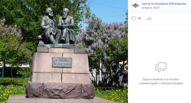 Ремонтно-реставрационные работы проходят на объекте культурного наследия федерального значения — памятнике Карлу Марксу и Фридриху Энгельсу в Петрозаводске, сообщает пресс-служба Центра по государственной охране объектов культурного наследия Карелии 25 октября в соцсети «ВКонтакте». Памятник идеологам коммунизма Карлу Марксу и Фридриху Энгельсу был установлен в 1960 году в связи с празднованием 40-летия со дня образования Карельской Трудовой Коммуны.