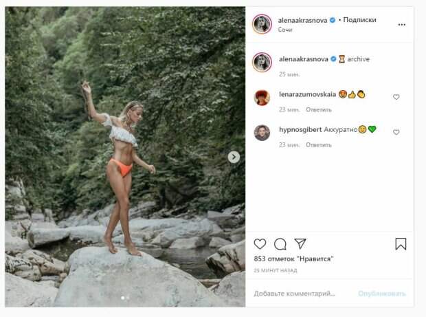 У модели настолько идеальные данные, что можно увидеть даже ребра, которые прямо выпирали. На втором кадре Лена уже сидела на обрыве, соблазнительно выгнувшись. Об этом пишет Politeka.net со ссылкой на страничку знаменитости. "Архив", - подписала красотка фото. Фанаты поставили почти 900 лайков и написали комментарии: "Аккуратно", "Круто", "Перебор с худобой" Сообщалось, что российская модель Алена Краснова пошалила в кружевном топе. «Мини серия…» - говорится в сообщении. На опубликованных фотографиях Преснякова позирует в кружевном боди, эффектно изогнувшись прямо в воде. На другом снимке красотка позирует все в том же боди, но уже задрав руки к верху на фоне неба. Мы писали, что российская модель Алена Преснякова похвасталась красотой во время отдыха с возлюбленным. «Давно не было лавстори❤️ Просто счастливые мы на прогулке в объективе у любимой Насти Фед», — говорится в сообщении. Напомним, озорная невестка Пугачевой в бикини пошалила в воде Также Politeka писала, что молоденькая невестка Пугачевой устроила стриптиз прямо посреди поля А еще Politeka сообщала, что молодая невестка Пугачевой взбудоражила кадрами в тонком топике без белья