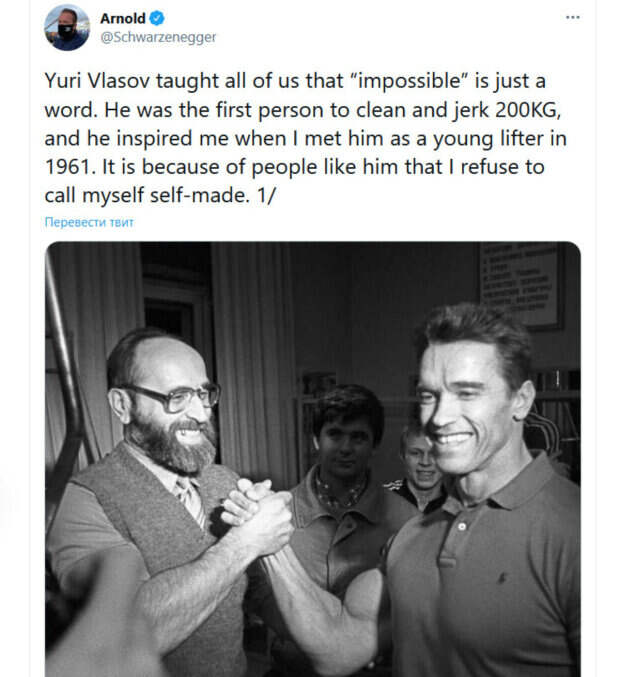 Знаменитый голливудский актер и бывший губернатор Калифорнии Арнольд Шварценеггер выразил соболезнования в связи с кончиной человека, который стал для него вдохновением и примером для подражания Утром 13 февраля в Москве ушел из жизни олимпийский чемпион по тяжелой атлетике Юрий Власов. Легендарному спортсмену было 85 лет.