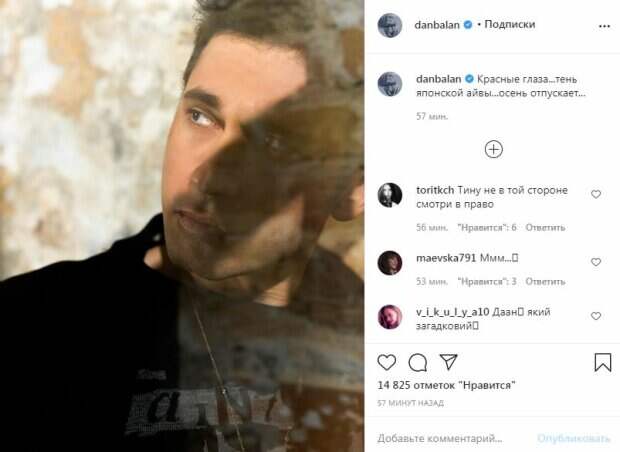 Артист бросил взгляд налево. В итоге фото получилось довольно интересным, тем более, что можно было рассмотреть лицо артиста крупным планом. "Красные глаза...тень японской айвы...осень отпускает...", - написал Балан. За час пост собрал более 15 тысяч лайков и много комментариев. "Я не сплю?!?!?! Вторая фотка за неделю!!!