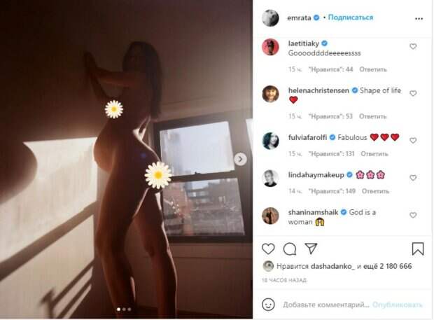 В этот раз красотка разделась на камеру для известного фотографа и устроила съемку прямо в ванной комнате, не скрывая наготу. Лишь бюст Эмили прикрыла руками, чтобы хоть как-то скрыть лишнее. Таким образом модель хотела акцентировать внимание на своей фигуре, ведь совсем скоро она должна родить малыша, пол которого тщательно скрывает. «Форма жизни ❤️; Сказочно; Бог - это женщина; Это я или ты была беременна 3 года; Уят) куда бедный муж смотрит