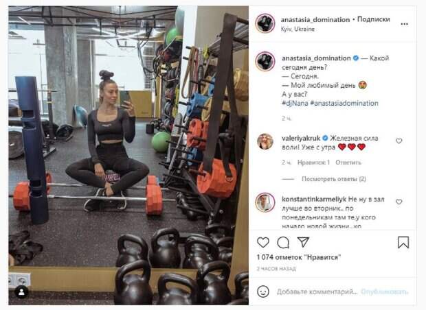 net со ссылкой на страничку знаменитости. "— Какой сегодня день? — Сегодня. — Мой любимый день А у вас?", - написала звезда под фото. Фанаты поставили более тысячи лайков и написали комментарии: "Железная сила воли. Уже с утра", "Не, ну в зал лучше во вторник.. по понедельникам там те, у кого начало новой жизни... ко вторнику это у них проходит и можно врываться", "Ну ... судя по кол-ву железа, тяжёлый!", "Ох, любимые гирьки, моя тема", "Я обязательно с вами проведу день. Вы сногсшибательная", "Прекрасный день", "Правильно, похвально", "Так а гирьки поднимала сегодня", "Первый весенний". Мы писали, что украинская певица, бывшая солистка группы "Nikita" Анастасия Кумейко показала свои формы с необычного ракурса. Анастасия Кумейко нарядилась в обтягивающий черный костюм с пикантным вырезом на груди и приняла пикантную позу в тренировочном зале. Красотка оперлась локтями о пол, свесив голову вниз, стала на носочки и подняла пятую точку высоко вверх. Напомним, экс-Nikita Кумейко в прозрачной кофточке с бесстыдным декольте распалила аппетит А еще Politeka писала, что экс-Nikita Кумейко в прозрачной кофточке с бесстыдным декольте распалила аппетит Также Politeka сообщала, что разгоряченная экс-Nikita Кумейко в белье и ботфортах показала свою гибкость
