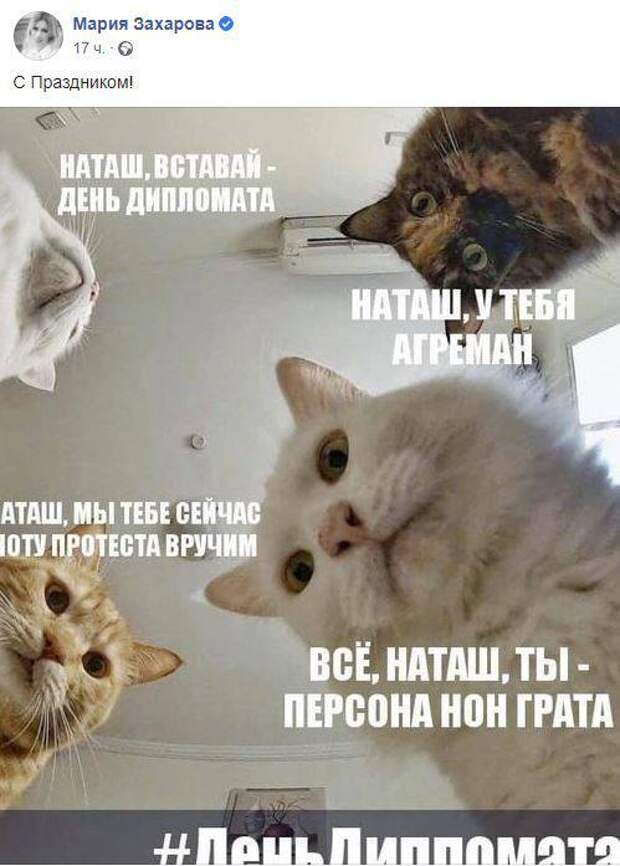 Официальный представитель МИД РФ Мария Захарова поздравила коллег с Днем дипломата. По случаю праздника Захарова обыграла известный мем с котами, который разместила на своей странице в Facebook. Оригинальный мем с четырьмя котами, которые пытаются разбудить свою хозяйку Наташу с фразами, что «уже шесть часов утра» и «они уронили вообще все», обрел популярность в 2020 году.