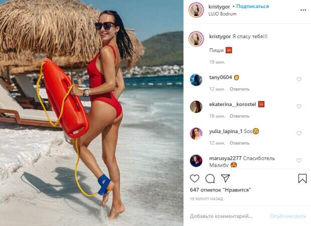 Да и в руках у Кристины был специальный агрегат, с которым любила бегать у кромки океана американская красотка в телешоу. Кристина с мокрыми волосами и ослепительной улыбкой застыла в шаге, будто бы готова сорваться и побежать кого-то спасать. Стоит отметить, ее стройной фигуре могла бы позавидовать сама Памела, образ с которой скопировала любовница Остапчука. "Я спасу тебя!!! Пиши 🆘", - сообщила красотка под фото. Пользователи кинулись комментировать увиденное: "Спасатель Малибу 😍" "Красавица🌸" "Такие фотки у тебя крутые, вообще 😍" "Какой там классный белый песочек😍😍😍" Ранее мы рассказывали, что Горняк похвасталась загорелыми прелестями в желтом бикини. Девушка приняла жаркую позу на белом песке, широко расставив ноги, сидя на коленях. В руках довольная отдыхом Кристина держала коктейль с соломинкой. Красотка зачесала назад влажные волосы и одарила фолловеров очаровательной улыбкой, не скрывая роскошных форм. «Фото заряжено на позитив! А я продолжаю заряжаться энергией солнца, наполняться и радоваться жизни! Каждый раз заходя в море, произношу громко: «я люблю тебя ЖИЗНЬ»! 🧡», - написала Кристина. Напомним, что любовница Остапчука высказала все, что думает о рухнувшем браке телеведущего Как сообщала Politeka, любовница Остапчука публично высказалась о новых отношениях: "Я никогда не была. ..". Также Politeka писала, что Осадчая показала фото Остапчука с новой любовницей, гремит скандал.