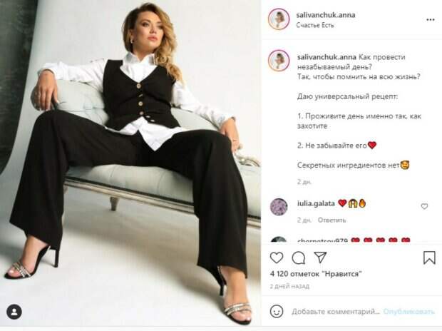 Из-за этого на выходных Саливанчук решила поднять тему время, которое следует уделять близким и как это лучше сделать правильно. «Так устроена жизнь: всю неделю мы ждем выходных, чтобы наконец… Наконец что? Чтобы заняться: уборкой, сходить за покупками, посидеть в Инстаграме? Нет, и ещё раз нет! Хватит проводить драгоценное свободное время за обыденными делами. Намного лучше — побыть со всей семьёй. Устроить что-то интересное и запоминающееся. Вариантов сотни! Дома, на улице или далеко от дома в поиске приключений. Но на самом деле совсем неважно, что вы будете делать, важно что вместе