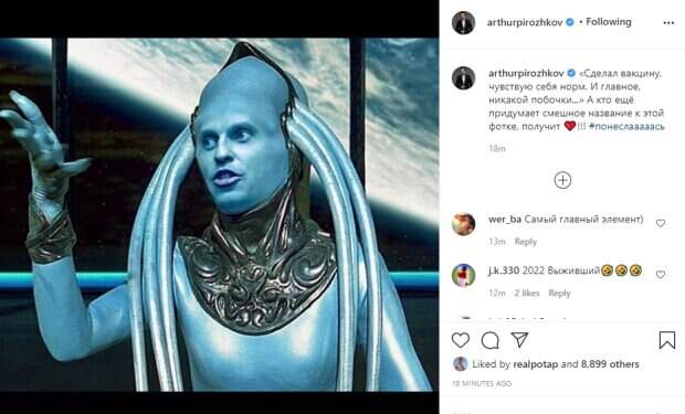 Российский шоумен Александр Ревва, также известный под псевдонимом Артур Пирожков, примерил фантастический образ из фильма Как пишет Politeka.net, он разместил на своей странице в соцсети "Инстаграм" изображение, на котором прикрепил свое лицо к певице из "Пятого элемента". Получилось, что Александр Ревва посинел и отрастил длинне щупальца на голове.