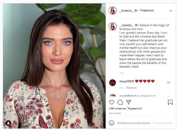 На новом фото Ястремская позировала в наряде с вырезом. Красотка смотрела в камеру, демонстрируя свою красоту. "Верю в волшебство доброты и любви. Я благодарный человек. Каждый день я обращаюсь к Богу и Вселенной и благодарю их. Я считаю, что благодарность может не только принести пользу вашей самооценке и психическому здоровью, но также улучшить ваши отношения с другими людьми и сделать их счастливее. И я хочу научить других искусству благодарности и показать людям преимущества этой красивой привычки", - написала Ястремская. Фанаты поставили более 200 лайков и написали комментарии: "Ой, люблю тебя так сильно, королева", "Мы любим вас из Филиппин", "Ты такая красивая", "Твоя красота кажется волшебной". Напомним, "Мисс Украина 2020" Ястремская показала, как достигает идеала в спортзале А еще Politeka писала, что "Мисс Украина" Ястремская в купальнике с банным веником показала свой способ оздоровления Также Politeka сообщала, что "Мисс Украина 2020" Ястремская сверкнула фигурой в мини-платье с камнями