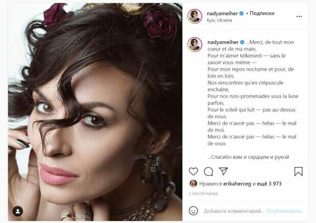Так, брюнетка опубликовала снимок, представ в нежном романтическом образе. Надя сделала прическу с аккуратными локонами и украсила голову сухими цветами. Разные украшения завершили ее образ. Также Мейхер сделала макияж с акцентом на красивый взгляд. Артистка подписала снимок стихом Марины Цветаевой "Мне нравится, что Вы больны не мной" на французском языке, а потом и перевод. За два часа публикация собрала почти 4000 лайков и много комментариев. "Моя невероятная