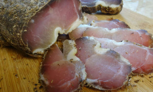 В домашних условиях выходит великолепное мясо холодной сушки. Основной процесс проходит без нашего участия: мы просто повесим заготовку на веревку и подождем. Мясо лучше брать из задней части свинины с рынка. Жир убирается практически весь, он в таком рецепте не нужен. Первой делается в глубокой миске солевая подложка, в нее укладывается мясо.