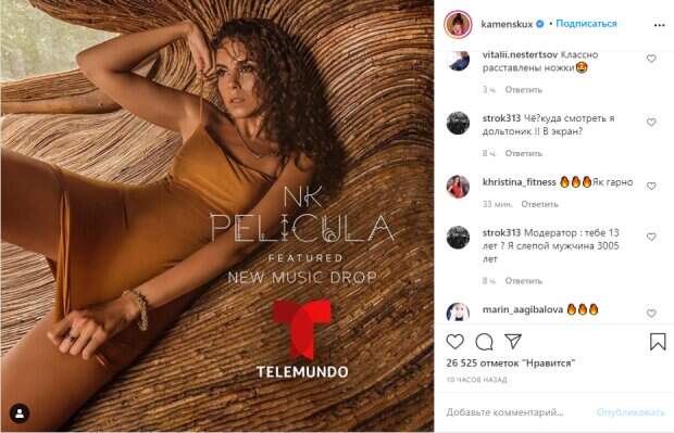 Специально к премьере Настя снялась в пикантной фотосессии, кадры из которой показывает едва ли не каждый день у себя в Инстаграм. На новом фото певица блистала в оранжевом мини-платье на тонких лямках, с массивным браслетом из золота, а также таким же колье. Мокрые волосы Насти уложены мягкими волнами на плечи. Для большей пикантности Настя даже слегка задрала платье, чем обратила внимание фанатов на себя. «Thank you @telemundo @latinxnow for adding my #PELÍCULA lyric video to #NewMusicDrop Such an honor! ❤️