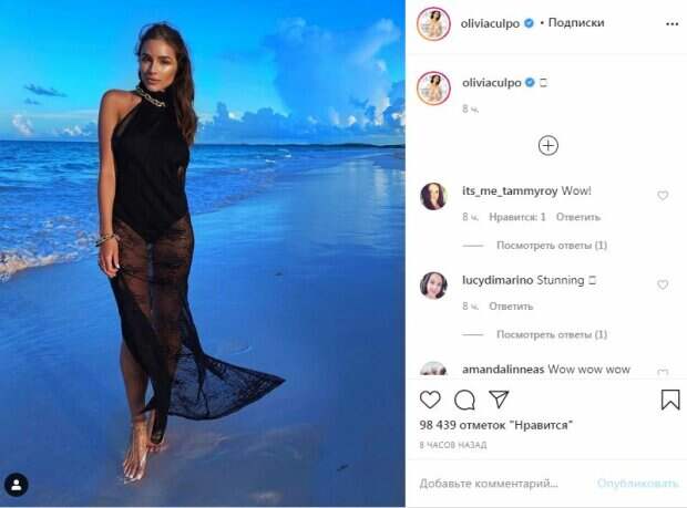 Под прозрачной накидкой виднелось черное боди с пикантными вырезами по бокам. Можно заметить, как грудь едва не выпрыгивает из разрезов. Прозрачная юбочка развеивалась от ветра. Под ней можно разглядеть стройные и ровные ножки Оливии. Модель встала на носочки, чтобы сделать силуэт еще "тоньше". Завершали образ Оливии крупные цепи на шее и руке, а также другие аксессуары. Соблазнительница позировала на берегу, когда солнце только скрылось за горизонтом. Ветер поигрался с волосами шатенки. Снимок вышел очень жарким и загадочным. За восемь часов пост собрал почти 100 тысяч лайков и много комментариев. Пользователи сети поразились красоте знаменитости и попросили выкладывать больше фото с отдыха. Напомним, Оливия Калпо предстала в блестящем купальнике с длинными рукавами. Завершили ее образ повязка в тон и бирюзовые украшения на руке и ноге. Бойфренд обнимал модель и выглядела она при этом очень довольной. Парень прижал Калпо к себе и поцеловал, а она в свою очередь закрыла глаза от удовольствия. Ранее сообщалось, что Оливия Калпо позировала в белом халате, который спустила с плеч. Звезда похвасталась не только формами, но и шелковой кожей. Такой красоткой хочется любоваться вечно. Пышная и аккуратная укладка из длинных волос придавала образу некой роскоши. Напомним, самая красивая женщина планеты Оливия Калпо взбудоражила «проукраинским» номером: «горячая смуглянка» Как сообщала Politeka, Мисс Вселенная Оливия Калпо сводит с ума горячими фото: «Вы заставляете меня…» Также Politeka рассказывала, что у горячей «Мисс Вселенная» Оливии Калпо развязался купальник на пляже: «Папа будет в бешенстве!»
