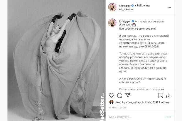 Жена телеведущего Владимира Остапчука Кристина Горняк рассказала о своих планах на 2021 год Как пишет Politeka.net, красотка выложила на своей странице в соцсети "Инстаграм" новое фото в необычном платье с длинным подолом из газовой ткани. Из-за черно-белого формата кажется, что наряд сливается с телом Кристины, на деле же он просто обтянул ее бюст и талию.