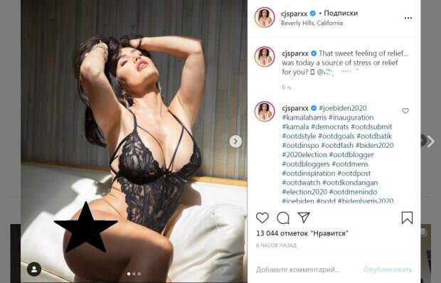 Модель красиво выгнулась, демонстрируя формы во всей красе, тонкие лямки подчеркнули объем грудей. Крой соблазнительного боди, оголил пышные бедра и упругие ягодицы. Модель распустила волосы, и приоткрыв губы, зачесала их назад. Звезда закрыла глаза, направив их к потолку. На другом фото Кассандра слегка выставила упругие ягодицы. Модель завершила образ различными украшениями и макияжем, подчеркнувшем пухлые губы и красивые глаза. "Это сладкое чувство облегчения ... что было сегодня источником стресса или облегчения для вас?