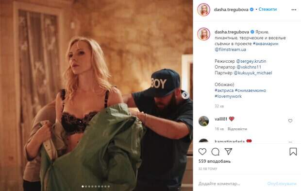 На других - дерзкая Даша запрыгнула в постель в красном пеньюаре. На некоторых снимках девушка разгорячила любовными "утехами" с коллегой-актером. "Яркие, пикантные, творческие и веселые съёмки в проекте #аквамарин @filmstream.ua. Обожаю)", - подписала фото звезда. Пользователи за короткое время успели поставить почти тысячу лайков и оставить комментании: "Вау! Красотка!