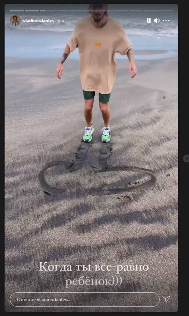Известный певец Владимир Дантес, муж Нади Дорофеевой, показал, как развлекается с женой на пляже На кадрах Владимир позировал в футболке и шортах. Дантес дополнил образ бейсболкой и кроссовками, показавшись возле воды. Певец начал рисовать детородный орган на песке ногами, пока Надя комментировала происходящее.