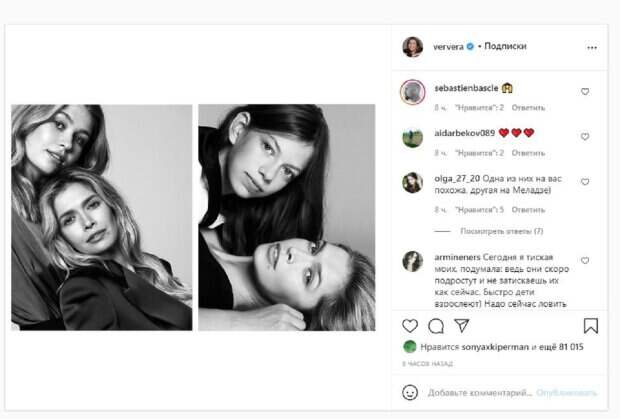 Снимки получились очень личными и семейными. Об этом пишет Politeka.net со ссылкой на страничку знаменитости. "Хочется их заобнимать, затискать, а они уже такие большие.. две мои вселенные Соня и Сара", - написала Вера. "Люблю тебя бесконечно", - ответила Соня. Фанаты поставили более 80 тысяч лайков и написали комментарии: "Дай Бог еще одну вселенную", "Прекрасные девочки", "Одна из них на вас похожа, другая на Меладзе)", "Красавицы!!!! Такие вы нежные", "Доброе утро, какая у вас семейная любовь", "Да, действительно. Время летит, дети быстро растут", "Боже, на первом фото ровесницы, сестрички?". Мы писали, что Вера Брежнева похвасталась семейной идиллией в компании мужа Константина Меладзе. Певица призналась в подписе к снимку, что она с мужем занимается скандинавской ходьбой каждое утро. Это помогает им не только укреплять мышцы ног, но и улучшать работу сердца, а также легких. Напомним, Вера Брежнева в космическом наряде нырнула в виртуальную реальность А еще Politeka писала, что непричесанная Брежнева похулиганила без Меладзе, раскинув ноги перед зеркалом Также Politeka сообщала, что 38-летняя Вера Брежнева рискнула изменить внешность и избавиться от главной "изюминки"