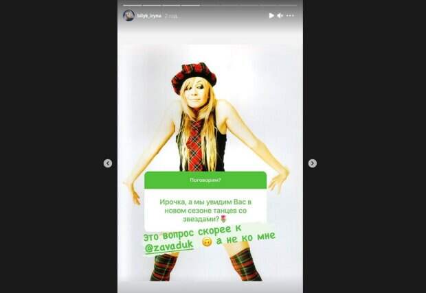 Отметила она уклончиво. Однако не стала отрицать, что хотела бы выйти на паркет популярного проекта. «Это вопрос скорее к @zavaduk, а не ко мне», - ответила певица, переадресовав вопрос к продюсеру шоу. Также Билык показала свое фото, на котором позировала в ярком клетчатом берете, галстуке и чулках. Напомним, ранее у Ирины Билык и Екатерины Кухар возник конфликт. Ирина Билык обиделась на судью Екатерину Кухар, которая прокомментировала выступление одной из пар - Виктории Булитко и Дмитрия Дикусара - бывшего мужа певицы. "Я сегодня с восторгом наблюдала за такой, другой Булитко. И наконец забыла про Ирину Билык", - начала свой комментарий после выступления участников шоу прима-балерина. В ответ на комментарий балерины артистка Билык на своей странице в Instagram написала, что она ее унижает себя ненавистью к более успешным артистам. "Хочу просто отметить, что когда все, что остается у центрального канала, это плохоговорящие балерины, что потеряли признание коллег и любовь публики, компенсировать неприятные вещи с помощью моего имени просто дно. Вам, как приме-балерине в далеком прошлом неоднократно намекала аудитория многих артистов: не надо так, не унижайте себя ненавистью к более успешным", - написала в фотоблоге Ирина. В свою очередь Екатерина Кухар не прошла стороной эти слова и тоже ответила Ирине Билык, отметив, что совсем не хотела задеть певицу. "Вспоминая о вас в таком рейтинговом шоу, я отдавала вам честь. Для меня ви незабываемая певица. И мне очень жаль, что вы этого не поняли", - написала в Instagram балерина. По мнению Кухар, кто-то вместо Ирины мог разместить такой провокативный пост в соцсети. "После вашего обращения, (мне было непонятно, почему вы не обратились ко мне напрямую, хотя бы через отметку), сложилось впечатление, что этот текст написал кто-то за вас. Я уверена, что вы душевная и мудрая женщина", - сообщила в фотоблоге Екатерина. Напомним, экс-муж Билык и Шоптенко Дмитрий Дикусар покорил эффектным брутальным образом: "Все хотят красивого..." Как сообщала Politeka, 50-летняя Билык блеснула фигурой в лосинках перед "расфуфыренными" звездами "Женского Квартала": "Наслаждайтесь" Также Politeka писала, что 50-летняя Билык резко осадила красотку из "Женского Квартала", артистка не сдержалась: "Кошмар! Принесите..."