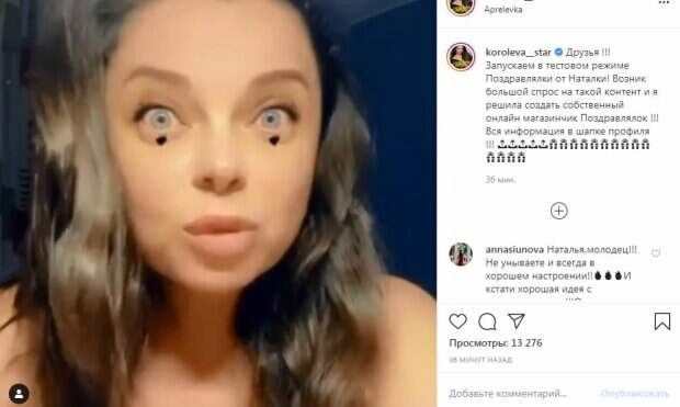 Возник большой спрос на такой контент и я решила создать собственный онлайн магазинчик Поздравлялок!", - говорится в подписи к видеообращению, которое певица опубликовала в Instagram. Поклонникам пришлась по душе такая идея. Но в большей степени фанаты обратили внимание на новую внешность Наташи Королевой. Некоторые комментаторы даже отметили, что певица помолодела после карантина. Но были и такие пользователи, которые предположили, что у Королевой серьезные финансовые проблемы, если она решилась на "сервис поздравлений". "Наталья,молодец! Не унываете и всегда в хорошем настроении! И кстати хорошая идея с поздравлениями! Очень креативно", "Ох Наташка, все так плохо, видимо", "Главное, чтобы Тарзан Ваш тоже не подрабатывал в кризис для женщин поздравляльщиком", "Иди работай!", "Обалдеть, как круто", "Красотулька, помолодела", "Красотка наша", "Наталка уже поднадоела", - написали они в комментариях под публикацией звезды. Напомним, Тарзан обратился к красоткам и пообещал им драйв, Королева будет в бешенстве: "Ну, что...". Как сообщала Politeka, Тарзан огорошил смелым фото с мускулистым другом, Королева не у дел. Также Politeka писала, что Наташа Королева взобралась на гигантский стул и рассыпалась в благодарностях сыну.