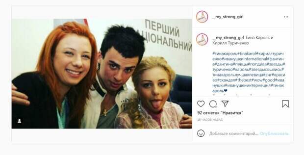 Туриченко и Кароль позировали рядом с рыжеволосой девушкой. Все выглядели счастливыми. А Тина игриво выставила язык. Публикация собрала почти 100 лайков и немного комментариев. "Приятные молодые Тина, Кирилл и девушка", - написал один из пользователей сети. Напомним, на Ютуб-канале "Алена, блин" артист рассказал, что он впервые познакомился с Тиной Кароль на фестивале "Черноморские игры". На тот момент ему было 18 лет, а молодой певице всего 16. Их пути разошлись, но они встретились в Киеве во время Нацотбора на Евровидение. Там чувства вспыхнули с новой силой. Тина решила скрывать все отношения от продюсера, очень переживая, чтобы тот не узнал. После участия в "Евровидении" артистка стала настоящей звездой, при этом продолжая свой тайный роман. "Разбила сердце, это правда. Мы встречались очень тайно, там где-то, когда все уезжают, я приезжаю к ней и мы тихонечко там живем в однушке, аккуратненько. И рано уезжал, чтобы никто не знал. Скрывали долгое время", - рассказал Туриченко. По мнению артиста, Тина тогда уже начала встречаться со своим будущим мужем Евгением Огиром. Напомним, Кароль рухнула на сцене и "потеряла" платье, конфузы попали в Сеть: "Аж сердце остановилось" Как сообщала Politeka, Кароль в белом костюме понежилась в постели, хвастнув естественной красотой: "А она хороша" Также Politeka писала, Тина Кароль сразила наповал, показав свою "изюминку" в платье с вырезом: "Обалдеть"