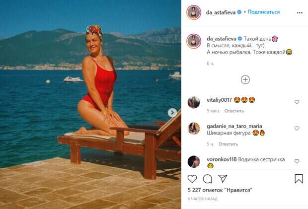 В смысле, каждый... тут) А ночью рыбалка. Тоже каждой", - сообщила модель в подписи к снимкам. На троих опубликованных снимках Даша смогла показать себя во всей красе: на фоне моря и гор модель позировала в разных ракурсах. Особое внимание поклонников привлекло полное отсутствие макияжа. "Красная королева. Как водичка?", "Шикарная фигура", "Дашуля, какая же вы красивая и шикарная женщина", Ой-ой какая барракуда", "Хороша наша Даша! Прям Шэрон Стоун в молодости", "Даша, это так мило)", - писали под постом модели. Ранее артистка решила показать в социальной сети Инстаграм на своей странице в разделе Стори, как развлекалась в ночном клубе ночью. Напомним, Астафьева устроила жаркую прогулку в киевском метро Как сообщала Politeka, фигуристая Даша Астафьева едва не засветила лишнее, задрав ноги в легком платье: бесстыжие кадры Также Politeka писала, что роскошная Астафьева в красном показала, что значит совершенство: «Нельзя быть такой…»