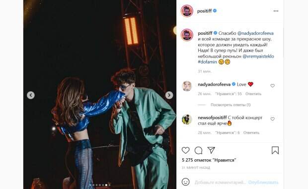 На своей странице в Инстаграм он опубликовал пост, в котором поделился впечатлениями от концерта. «Спасибо Наде и всей команде за прекрасное шоу, которое должен увидеть каждый! Надя! В супер путь! И даже был небольшой реюньон «Время и Стекло», - написал Алексей. Он также поделился снимками с концерта. На многих из них певец был запечатлен во время совместного выступления с Дорофеевой на сцене. При этом Надя была одета в шикарный наряд: на ней был короткий топ, короткий синий пиджак, а также брюки из просвечивающейся ткани, под которыми было видно белье певицы. На одном из фото Позитив трогательно поцеловал руку своей бывшей коллеги. На другом снимке артисты трогательно обнимались. В комментариях к посту поклонники поделились своими впечатлениями. «С тобой концерт стал ещё ярче», «Самые лучшие и любимые», «Спасибо что на несколько минут восстановились как группа», «Любовь безграничная», «Самые лучшие, очень скучаю по группе, и буду помнить всегда», - пишут люди. Напомним, Позитив не оценил откровений бывшей супруги после расставания: "То, что она сделала...". Как сообщала Politeka, Дорофеева и Позитив впервые после распада "Время и Стекло" встретились на сцене: "Подарок для всех поклонников! ". Также Politeka писала, что подопечная Потапа Андраде на фоне слухов о романе с Позитивом сделала признание: "Не могу скрыть...".