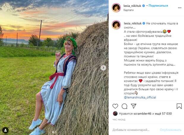 Оригинальный образ дополнили красные бусы. Телеведущая вышла в поле, где позировала среди снопов сена - фото получились атмосферными, яркими и живыми. "Настоящая украиночка" одарила поклонников искренней улыбкой. "Не отдыхать ушла в снопы... А стала сфотографировалась😂❤️... на мне бойковский традиционный наряд! Бойки - это этническая группа, проживающая на западе Украины, славятся своей традиционной кухней, диалектом, песнями и танцами! Местные женщины варят борщ с пшеном и могут останавливать дождь...", - подписала кадры Никитюк. Пользователи кинулись обсуждать увиденное: "О це так чаклунка в зеленій хустці😻" "Леся, вам очень идёт зелёная хустка 👍" "Уууууххххх 🌼🌼🌼🌼🌼красотка" "Настоящая Украиночка! 😍" "Ты уже в битве экстрасенсов участвуешь как мольфарка?)" "Гуцулка Леся😍👑❤" "Ох и красивая девушка, смотрите, а то украдут и ищи ветра в поле, вернее, в горах!!!!" "Нет, Леся, тебе к лицу больше бренды)" "Похожа на сучасну Солоху👍" Ранее мы сообщали, Никитюк напугала "зеленым" фото. Девушка позировала на фоне стены с нарисованными грибами, в салатовом костюме и черной юбке на запах. Кроме того, у Леси светились глаза, как у "монстра". Напомним, взбалмошная Леся Никитюк назвала нового героя "Холостяка": неожиданный выбор Как сообщала Politeka, роскошная Никитюк в кружевном белье показала, как изменилась ее фигура благодаря спорту. Также Politeka писала, что Леся Никитюк с огромным брюхом поразила нелепым видом, кадры облетели сеть: "Богиня пчел"