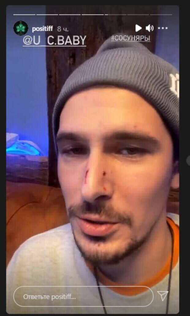 Вокруг него расположились его товарищи, один из них с телефоном и перебинтованной рукой. В глаза сразу же бросается окровавленное лицо Позитива, с двумя широкими царапинами на носу. Тем не менее, артист шутил, да и его друзья смеялись. "Ребзи, когда снимаешь тиктоки с U_C происходят такие вещи! Сосуняры...", - произнес экс-солист "Время и Стекло". "Леха, ты опять что ли дрался?", - спросил его за кадром один из рэперов. "Какого черта это произошло?", - не пряча улыбку спросил, якобы возмущенно, Позитив. Отметим, ранее ребята из группы U_C уже появлялись на совместных фото и с Позитивом, и с его бывшей коллегой из "Время и Стекло" Надей Дорофеевой. "Уффф...краши прям