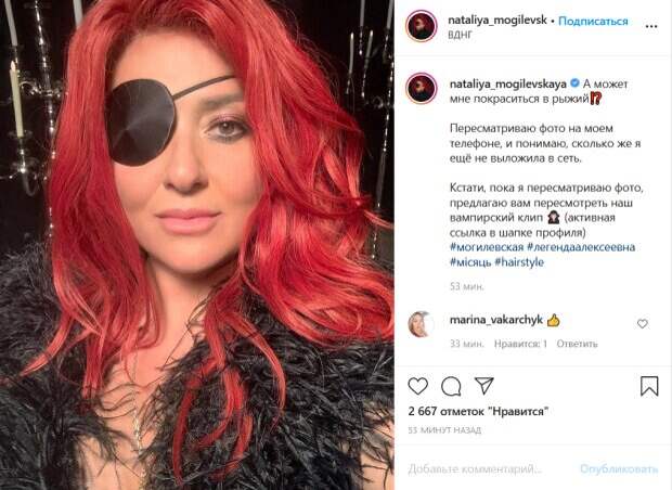 Как пишет Politeka.net, об этом она написала в своем Инстаграм. «А может мне покраситься в рыжий? Пересматриваю фото на моем телефоне, и понимаю, сколько же я ещё не выложила в сеть», - призналась Могилевская. Она также поделилась селфи, сделанным во время съемок ее недавнего клипа, в котором она предстала в роли роковой вампирши. В нем звезда красовалась в мрачном образе с ярко-красным париком и повязкой на глазу. Поклонники знаменитости активно комментируют ее пост. «Если душа просит- надо покраситься!», «Лучше в зеленый…гулять так гулять», «Ира Билык – 2», «Вам идет этот цвет», «Лиса Алиса! Точный образ!», «Вам очень хорошо в холодном белом, сейчас Вы особенно хороша», «Вам идёт, мне очень нравится, сама рыжуша», «Свой цвет лучше, а этот по праздникам», «Оу.... воу-воу...йо-хо-хо...что за пират?», «Что с глазом?», «Наталья, огонь», «Рыжий Ваш цвет!», - пишут люди. Напомним, поцелуй Могилевской со своим престарелым учителем вызвал скандал, кадры дерзости: "Наташа, не играй с дьяволом". Как сообщала Politeka, Могилевская в очках и с пучком на голове поразила внешностью в обычной жизни: «Я выбрала одного…». Также Politeka писала, что раскованная Могилевская в кожаном костюме бросилась в объятия молодого красавчика: «Так вышло, что…».