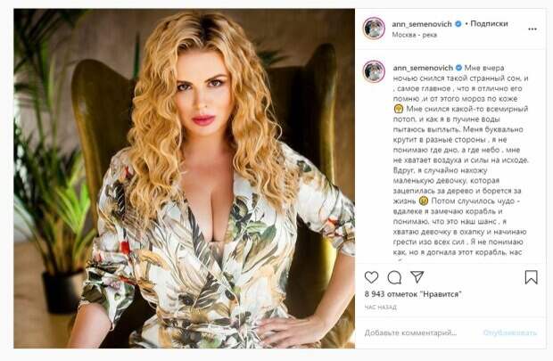 Об этом пишет Politeka.net со ссылкой на страничку знаменитости. "Мне вчера ночью снился такой странный сон, и , самое главное , что я отлично его помню ,и от этого мороз по коже. Мне снился какой-то всемирный потоп, и как я в пучине воды пытаюсь выплыть. Меня буквально крутит в разные стороны , я не понимаю где дно, а где небо , мне не хватает воздуха и силы на исходе. Вдруг, я случайно нахожу маленькую девочку, которая зацепилась за дерево и борется за жизнь", - написала Анна. Фанаты поставили почти 10 тысяч лайков и написали комментарии: "Счастливый сон. К счастливым переменам", "Какой необычный сон, целое приключение", "Фото огонь". Сообщалось, что известная российская певица Анна Семенович присоединилась к челленджу, который набирает обороты во всем мире. У себя в Инстаграм Семенович опубликовала соблазнительное черно-белое фото, на котором предстала во всей красе. Это фото артистка опубликовала в рамках челленджа в поддержку Стамбульской конвенции. Напомним, пышногрудая Семенович показала, как заманивает мужчин, видео А еще Politeka писала, что игривая Семенович задрала платье, засветив самые сладкие места Также Politeka сообщала, что фигуристая Семенович в купальнике устроила жару, забравшись в воду