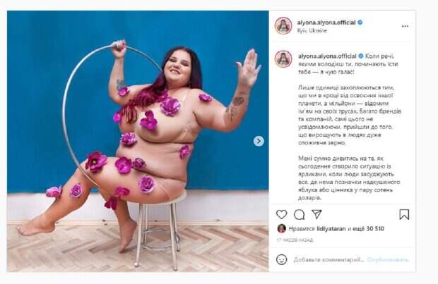 Образ дополнила красотка цветами, которыми украсила свое тело, а в руках держала обруч. Как можно понять, девушка решила скопировать западную певицу Карди Би. "И я не говорю, что нам надо отказаться от вещей, одежды и положения в обществе, но в ежедневной погоне за бирками и фейковых статусом в социуме, мы забываем о самом важном... Представим ситуацию: Твой знакомый нелестно прокомментировал «небрендовисть» твоего обуви или одежды, твои действия?", - написала исполнительница. Фанаты поставили более 30 тысяч лайков и написали комментарии: "Цветочек душа", "Неправда. В моем любимом секонд-хэнде - только лучшие брэнды", "Какая разница, какие на тебе кеды, если ты гуляешь в них по Парижу". Отметим, что певица переехала к своему возлюбленному. "Сегодня будет душевный разговор. Мы решили съехаться. В предыдущих отношениях сожительство происходило в Барышевке на моей территории. А теперь я переехала к нему. Его квартира находится дальше от репетиционной базы, студии звукозаписи, ресторанчиков и готовой кулинарии, центральных улочек и клуба Атлас в котором за год карантина я так и не побывала", - поделилась личным артистка. Напомним, Alyona Alyona, влюбившись по уши, встала на каблуки А еще Politeka писала, что Alyona Alyona рассекретила имя своего избранника, с которым начала жить вместе Также Politeka сообщала, что Alyona Alyona влюбилась по уши в парня с зелеными ногтями, первое фото парочки