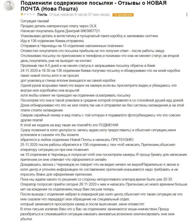 Вскоре отправление прибыло по месту назначения, и покупатель пообещал ее забрать, но ее статус в приложении не менялся. Покупатель перестал выходить на связь, поэтому мужчина запросил возврат в Киев и в отделении обнаружил, что его посылка упакована в фирменный пакет, который изначально не заказывал. "Одной рукой вскрываю пакет,что видно на камере, если вы просмотрите видео, и убеждаюсь что внутри моя коробка! Но она вскрыта! Хотя якобы клиент не приходил на отделение осматривать посылку", - подчеркнул пользователь сети. Уже дома мужчина обнаружил, что плата не его, так как отправлял деталь без системы охлаждения. Детальная проверка лишь укрепила продавца в подозрениях: "Сверив серийный номер и вид платы с той которую я подавал(по фото)убеждаюсь что это совсем другая плата! К этой же модели, на вид такая же плата! Но это подмена!". В итоге недовольный клиент хотел составить претензию, но операторы в Киеве и Черновцах слишком долго возились и не смогли помочь. "Излагаю Вам,что у Вас на отделениях занимаются мошенничеством. Прошу разобраться в сложившейся ситуации, наказать виноватых, возможно компенсировать мне мои убытки", - пишет автор отзыва. В комментариях отметили, что такие случаи на "Новой почте" случались и прежде: "Ты попал на плату! Такое у них часто происходит". Напомним, сотрудников "Новой почты" заподозрили во вскрытии посылок, пропадает даже валюта: "Как доказать..." Как сообщала Politeka, Операторов "Новой почты" заподозрили в навязывании платных услуг Также Politeka писала, что Новая почта вляпалась в скандал, украинцы жалуются на "наглость" с посылками
