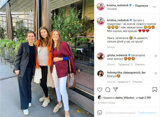 На снимке Кристину можно увидеть в компании двух других женщин, одна из которых явно беременна. Жена ведущего довольно улыбалась, позируя рядом с подругами. На ней были белые брюки, синяя кофта и стильный кардиган винного оттенка. «Встреча с подругами - как глоток свежего воздуха. И нам всегда мало. Мои хорошие, мои красивые. Внимание, вопрос. Как думаете, сколько детей у нас на троих?», - подписала фото Решетник. Под снимком отметился ее муж. «Многодетные наши красавицы», - написал он. Подписчики Кристины также отреагировали на ее пост. «У всех по трое?», «Будет 9?», «Красавицы», «9-й в животе», «9 точнее 9 в животе у вашей подруги», - пишут люди. Стоит отметить, что Решетники воспитывают троих сыновей. Напомним, ведущий "Україна має талант" Решетник взволновал фанатов перекошенным лицом. Как сообщала Politeka, ведущий "Холостячки" Решетник в элегантном костюме переплюнул Дэниела Крейга. Также Politeka писала, что ведущий "Холостячки" Решетник поделился важным моментом, который пережил с сыном.