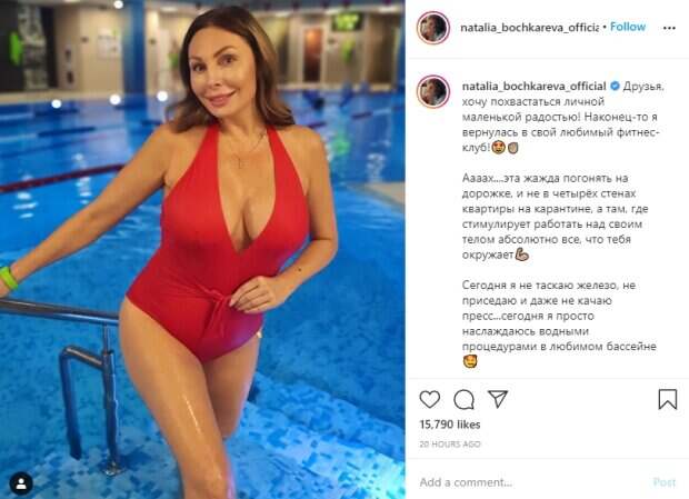 В таком наряде 40-летняя красотка попозировала на ступеньках, продемонстрировав все свои соблазнительные изгибы и формы. Судя по сухим волосам, Наталья Бочкарева еще не успела искупаться, однако ножки уже намочила. В описании актриса поделилась своими впечатлениями от водных процедур после строгого карантина: "Друзья, хочу похвастаться личной маленькой радостью! Наконец-то я вернулась в свой любимый фитнес-клуб!