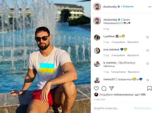 35-летний украинский певец Виталий Козловский привлек внимание праздничным фото Как передает Politeka.net, артист опубликовал свежий снимок в своем микроблоге в Инстаграм, на котором предстал в экстракоротких шортах красного цвета и белой футболке с принтом в виде украинского государственного флага.