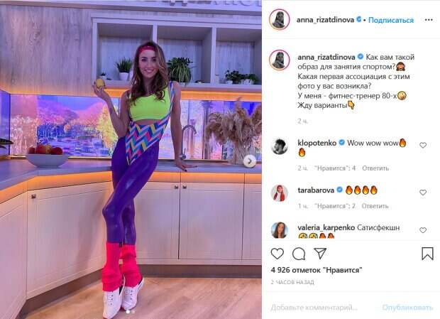 На ней кислотно-желтый спортивный топ, цветастый боди с глубокими вырезами и ярко-синие блестящие лосины. Такой наряд позволяет красотке в полной мере показать свою подтянутую фигуру. «Как вам такой образ для занятия спортом? Какая первая ассоциация с этим фото у вас возникла? У меня - фитнес-тренер 80-х», - подписала снимки Ризатдинова. Ее образ явно впечатлил победителя «Мастер-шеф» Евгения Клопотенко, который в комментариях смог написать только: «Вау вау вау». Поклонники гимнастки также не остались в стороне. «Сатисфекшн», «Может быть, аэробика тогда была, были лосины, и купальник с гетрами», «Наша красивая Аня! Очень рада была видеть тебя!», «Бомбически», «Супер! А-ля Джейн Фонда. Любовь и аэробика», «Первая ассоциация- акробатика по ТВ в 1980ых!», «Красиво! Взгляд сразу цепляет Анечка!)», «Вау Просто фигура космос))) Вы молодец!», «Праздник, диско. А на зиму настроение отлично поднимает!», «Купальник поверх это интересное решение, хотя по мне лучше без него, а в гетрах жарко будет ногам. А в целом ярко, фешн!», - пишут люди. Напомним, фаворитка Влада Ямы на "Танцях з зірками" Ризатдинова пленила формами в лосинах: "Блин, класс, Аня!". Как сообщала Politeka, фаворитка Влада Ямы выдала неприглядную правду о "Танцях з зірками": "Всегда был тяжелый. ..". Также Politeka писала, что фаворитка Ямы из "Танців з зірками" свела с ума пикантными вырезами на топе.