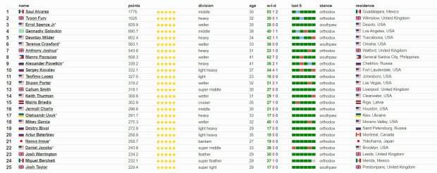 Таким образом, единственным боксером из Украины в первой 20-ке мирового рейтинга является Александр Усик, который занимает 17-е место. Лидером рейтинга является мексиканский боксер Сауль Альварес. Как известно, в ночь с 17 на 18 октября в Лас-Вегасе состоялся бой между украинцем и американцем. После 12 раундов по единогласному решению судей победу одержал Лопес: 116:112, 119:109, 117:111. Теперь он является обладателем чемпионом мира в легком весе и обладателем поясов WBC (Всемирного боксерского совета), WBA (Всемирной боксерской ассоциации) и WBO (Всемирной боксерской организации), которыми до этого владел Ломаченко, а также пояса IBF (Международной боксерской федерации). Украинец уже заявил, что он не согласен с решением судей присудить победу американцу Теофимо Лопесу в поединке за звание абсолютного чемпиона мира. Ранее мы писали о том, что что Александр Усик прокомментировал поражение Ломаченко стихом Бориса Пастернака «Быть знаменитым некрасиво». Напомним, Ломаченко удивил признанием после сенсационного поражения Лопесу. Как сообщала Politeka, Ломаченко сцепился с отцом Лопеса. Также Politeka писала, что нашелся боксер, который побьет Ломаченко.