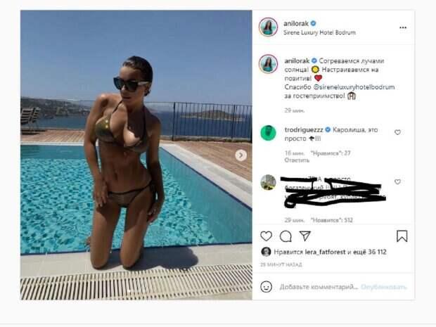 Певица также активно ведет блог в Инстаграм, где и показывает, как проходит отпуск. На новых фото Лорак показалась в купальнике и очках. Красотка сначала была у бассейна, а потом сделала несколько фото, забравшись в прозрачную воду. "Согреваемся лучами солнца! Настраиваемся на позитив!", - написала Лорак под фотографиями. "Каролиша, это просто молния", - написал шоумен Тимур Родригес. Фанаты поставили более 30 тысяч лайков и написали комментарии: "Очень горячо, хорошего вам отдыха, любим", "Нереальная красивая. Какой загар", "Новый альбом выйдет в сентябре или в октябре?Мы с нетерпением ждём!", "Боже, Каролин, вы настоящая шоколадка. Какой загар", " Я конечно очень извиняюсь, но грудь вообще не красивая, выпирающие шары, с большим расстоянием между друг другом, да ещё и в разные стороны...Зачем?!? Ради кого?!", " Титьки что ли увеличила?" Напомним, 10-летняя дочка Ани Лорак показала, кто еще живет вместе с ними, домашние кадры А еще Politeka сообщала, что Ани Лорак в спортивках хвастнула фигурой, заткнув за пояс 20-летних Также Politeka писала, что Лорак в платье с декольте заставила сердца мужчин биться быстрее