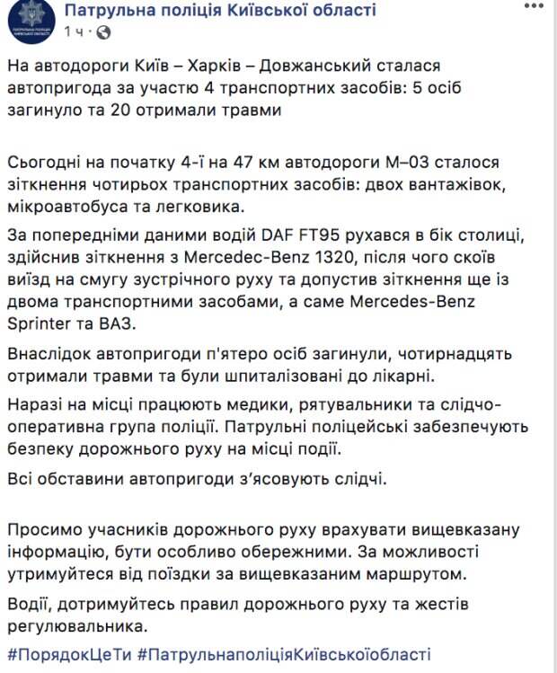 В Киевской области утром 11 сентября произошло масштабное ДТП Об этом сообщает Politeka со ссылкой на уведомление патрульной полиции Киевской области в Facebook. В результате аварии с участием четырех транспортных средств – двух грузовиков, микроавтобуса и легковушки 5 человек погибли и 20 получили травмы.