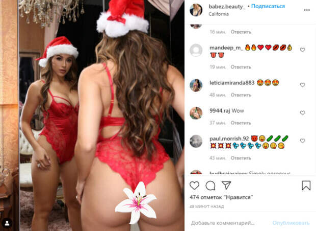 Девушка примерила лишь кружевной боди красного цвета и надела красную шапку Санты. Чтобы подчеркнуть одновременно и свою загорелую фигуру, а также подкачанные формы, она повернулась спиной к камере, но показала также бюст в зеркале. Благодаря удачному ракурсу, спортсменка не скрыла ничего: «Пришло время добавить традиционные фотографии шляпы Санты