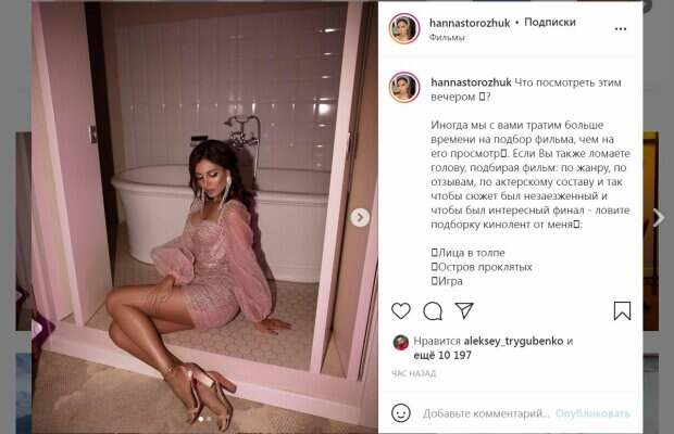 В Инстаграм девушка делится личным, и часто общается с подписчиками. В этот раз Анна Богдан посоветовала на просмотр несколько фильмов, подкрепив запись красивым снимком в вечернем платье с макияжем. Красотка в таком виде позировала на полу возле ванны. "Что посмотреть этим вечером