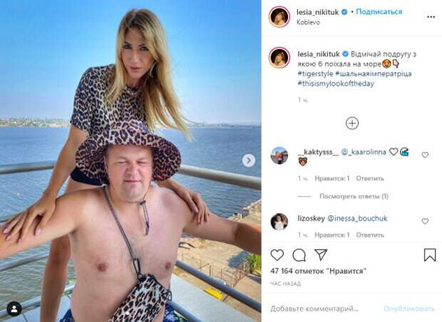Раздетый мужчина на фото был под стать ей: в леопардовой панамке и с сумкой в тон, висящей на шее. На одном из кадров Леся приняла жаркую позу позади неизвестного "богатыря", блеснувшего своей волосатой грудью, положив руки ему на плечи. Тот аж закрыл глаза от удовольствия. "Отмечай подругу с которой бы поехала на море😍👇🏻 #tigerstyle #шальнаяимператрица #thisismylookoftheday", - подписала снимки Никитюк. Пользователи кинулись обсуждать увиденное, гадая, кто же этот красавец в леопарде на фото. "😍суперские🌹" "Круті, неперевершені👍" "Дай леща хряку этому" "Главное!!!чтоб сумка на шее была🤣👌" "Хахаль твій?)" "Ой классс Лесюньчик ты у нас в коблево" "👍яка класна подруга😉😂" "Он слишком нежный 😂" "Её альтерэго)" Ранее мы сообщали, Никитюк поразила фото на сеновале. Звезда и тут отметилась с мужчиной - водителем из шоу "Ле маршрутка" Богданом Богдановичем. Телеведущая в одной курточке кислотно-розового оттенка полулежала на покрывале. Благодаря идеальному ракурсу стройные бедра девушки можно рассмотреть во всех деталях. "Хочеш большой и чистой любви, приходи на сеновал"; "Леся лежит смирно, как дрова, что ждут холодную зиму"; "Леся ждет ковалера на сеновале))"; "На стиле, носки под сандали👍🏻👍🏻😂 а Лесик, как всегда красотка🌸", - отреагировали пользователи. Напомним, шаловливая Никитюк покрутила упругим богатством в одном бикини А еще Politeka писала, что горячая Никитюк сверкнула дарами природы посреди ванной Также Politeka сообщала, что шаловливая Никитюк на фоне раздетого мужчины пустилась «во все тяжкие»