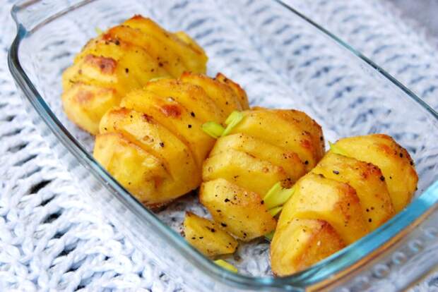 Обычно подобный способ приготовления картофеля называют в рецептах «шведским». Мне больше нравится «картошка-гармошка» — это как-то сразу и по-русски, и веселее становится. Несмотря на то, что блюдо имеет нарядный праздничный вид, делается оно довольно просто. Это немаловажно при подготовке, например, к новогоднему застолью, когда каждая минута на счету.